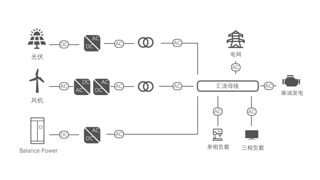 Balance Power應(yīng)用場(chǎng)景覆蓋削峰填谷、備用電源、動(dòng)態(tài)增容及余電消納,覆蓋電量100度~300度的用戶需求,可以接入風(fēng)機(jī)逆變器、光伏逆變器,以及柴發(fā)在交流側(cè)并機(jī)組成微網(wǎng),也可以與電網(wǎng)進(jìn)行并網(wǎng)運(yùn)行。